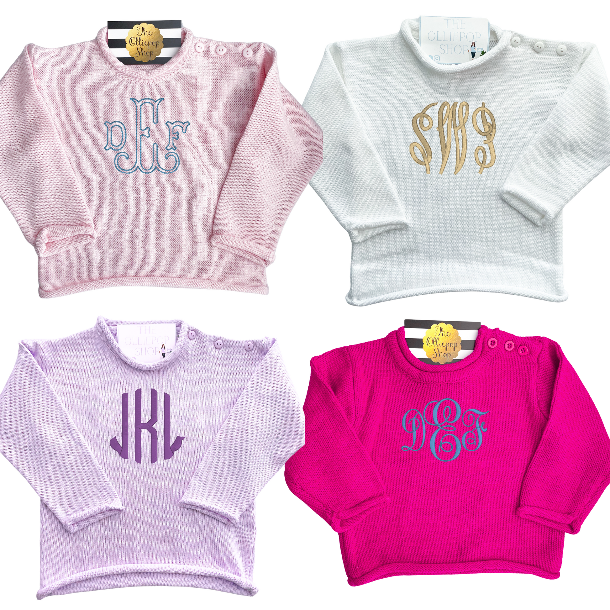 This listing is for a personalized name sweater with single or three letter monogram centered on the chest. The default thread color is white if you do not indicate a different color.