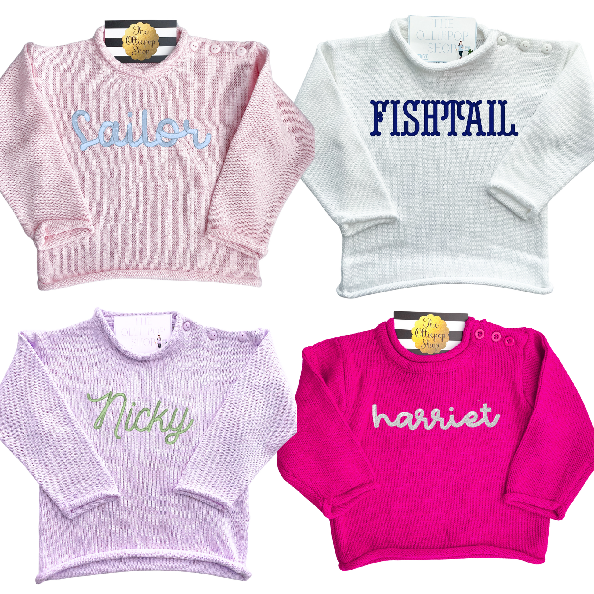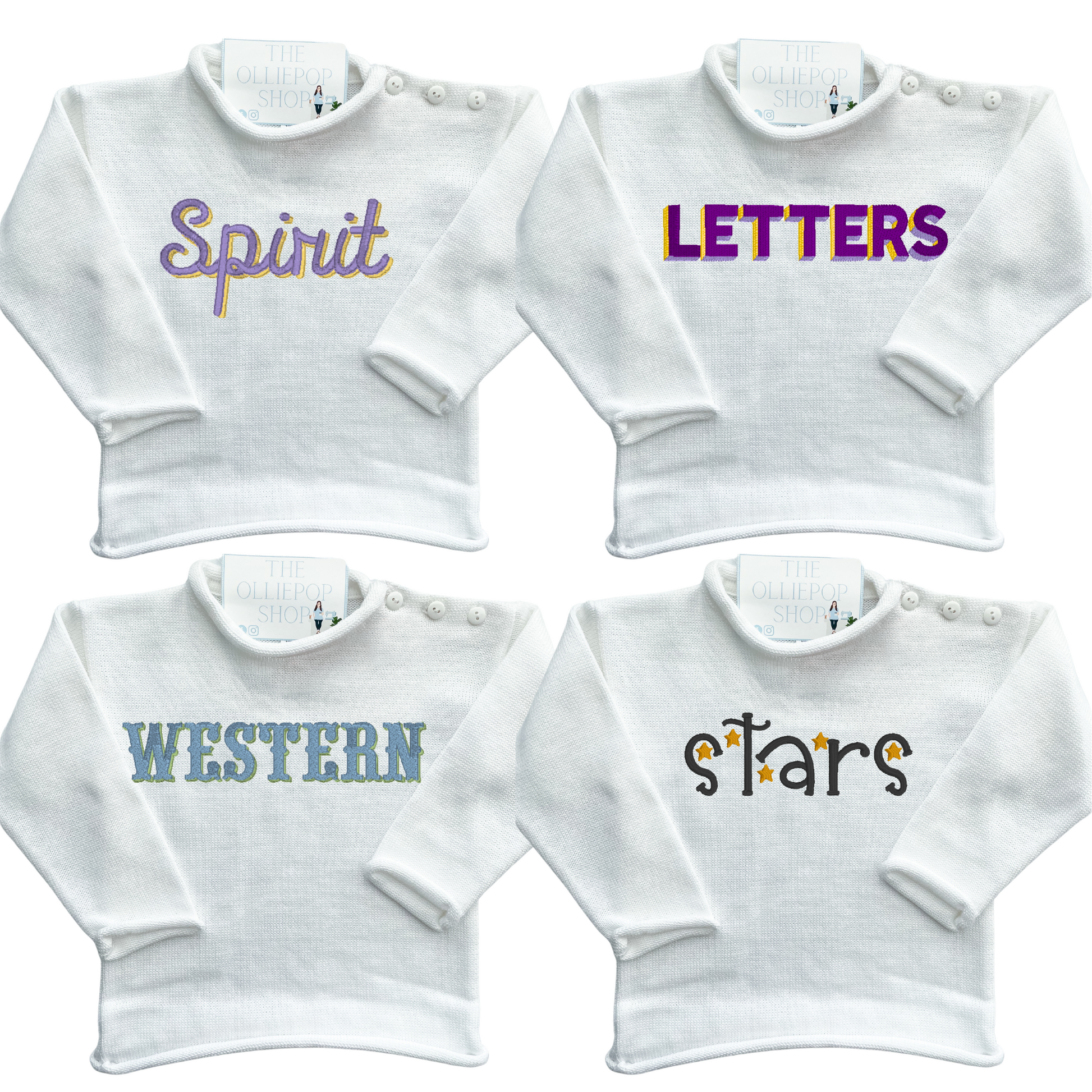 This listing is for a personalized name sweater with name centered on the chest. The default thread color is white if you do not indicate a different color.