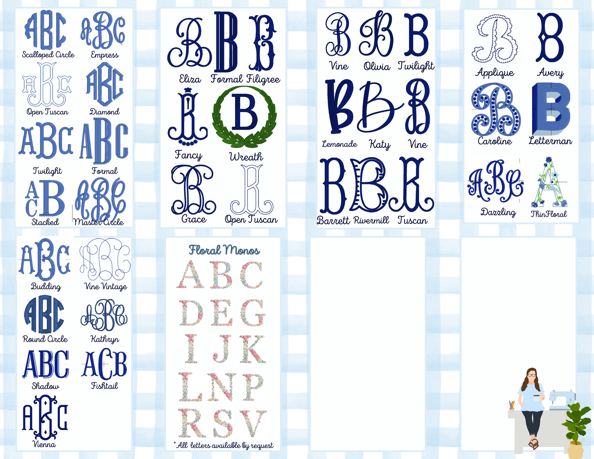 See all available fonts and designs on website menu! Please indicate font style and thread color in personalization box. If none chosen, default will be as pictured.