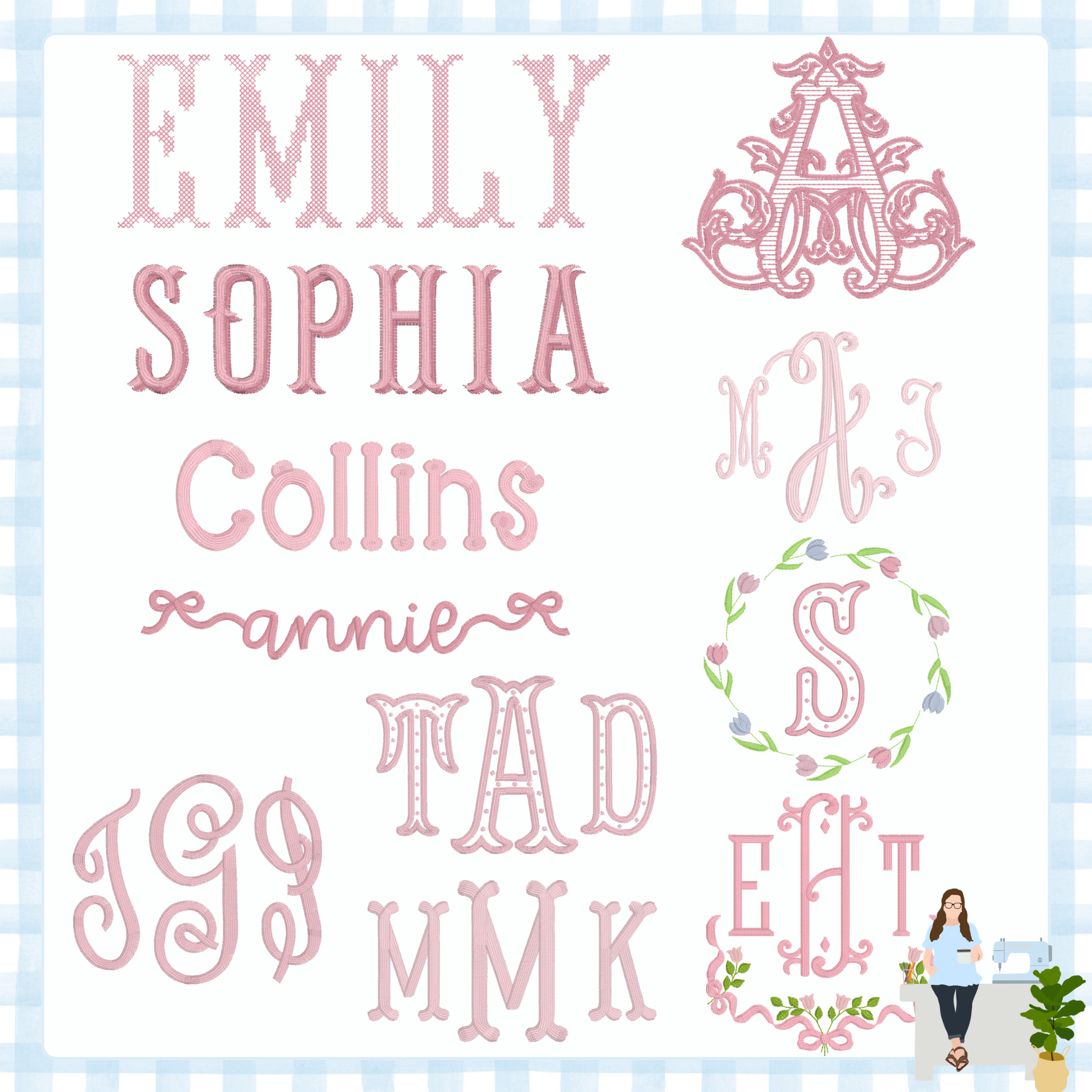 We can decide design and font later or you are welcome to choose now. Here are just a few ideas that we are loving right now. Name or mono will match the trim color unless otherwise stated.